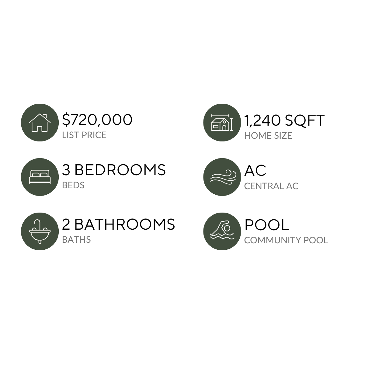 The home features three well-proportioned bedrooms, including a private primary suite with en-suite bath, plus flexible secondary bedrooms for guests, work, or whatever comes next. A newer AC unit, included washer, dryer, and refrigerator, and an oversized two-car garage add everyday convenience.